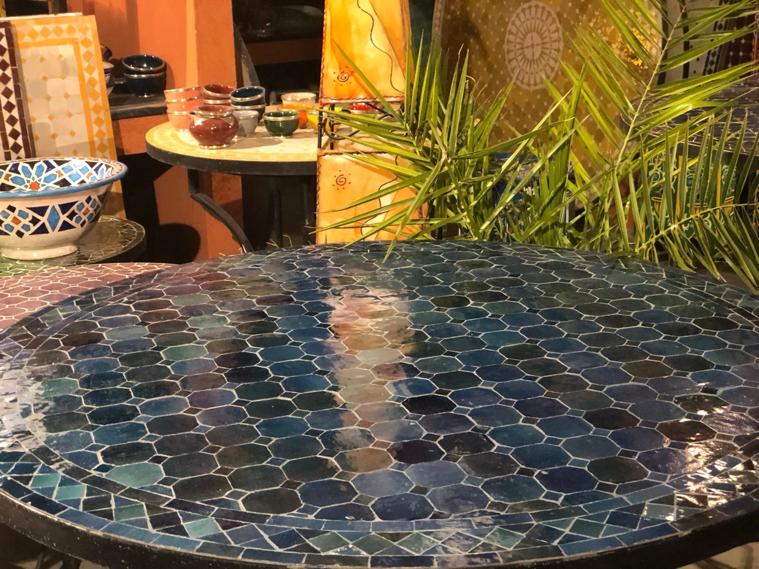 - Handgemaakt vakwerk: Iedere Marokkaanse mozaïek tafel is uniek, De handgemaakte tegels (zelliges) worden met de hand op maat gekapt en vervolgens handmatig in prachtige patronen gepuzzeld.